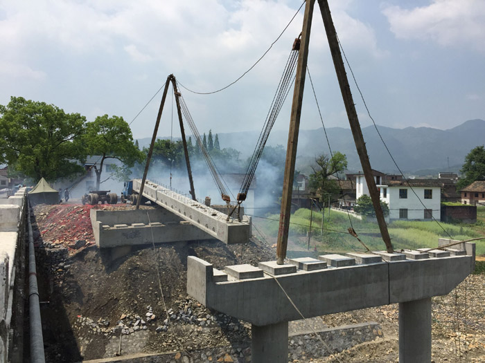 4月12日中午12時,位于炎陵縣S347項目新河西大橋建設現場,人字扒桿將一片長20米、重30.6噸的空心板梁從運梁車起吊,在參建人員的歡呼聲和鞭炮聲中,第一片空心板梁歷時5小時后平穩(wěn)、安全地安裝在支座上,成功架設。